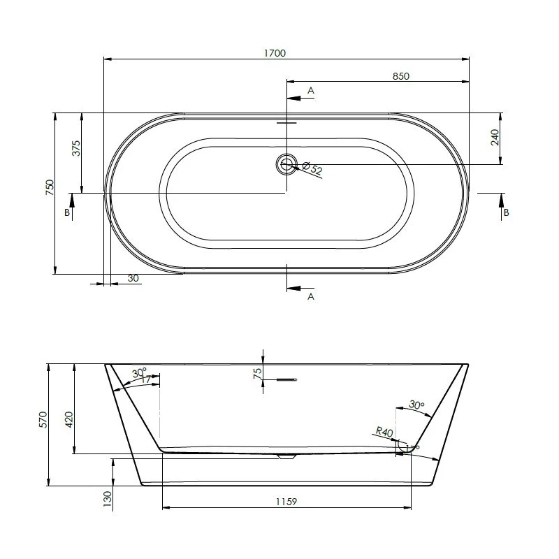 BC Designs Bletchley 1700mm x 750mm Oval Freestanding Double Ended Bath