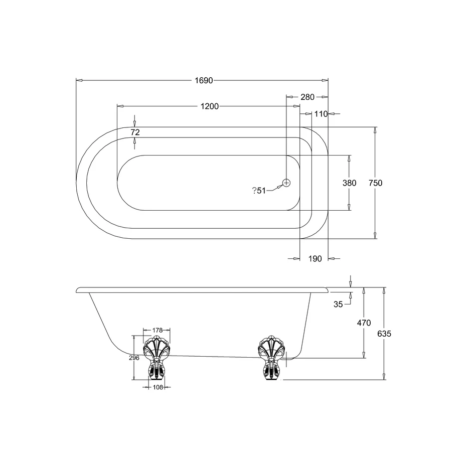 Displaced Capacity 115 litres (bath’s capacity less 70 litres)