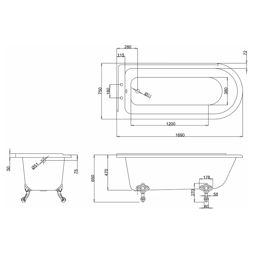 Consists of 1 x Hampton shower bath LH (170cm x 75cm) (E13) and 1 x Traditional leg set in chrome (E11 CHR)