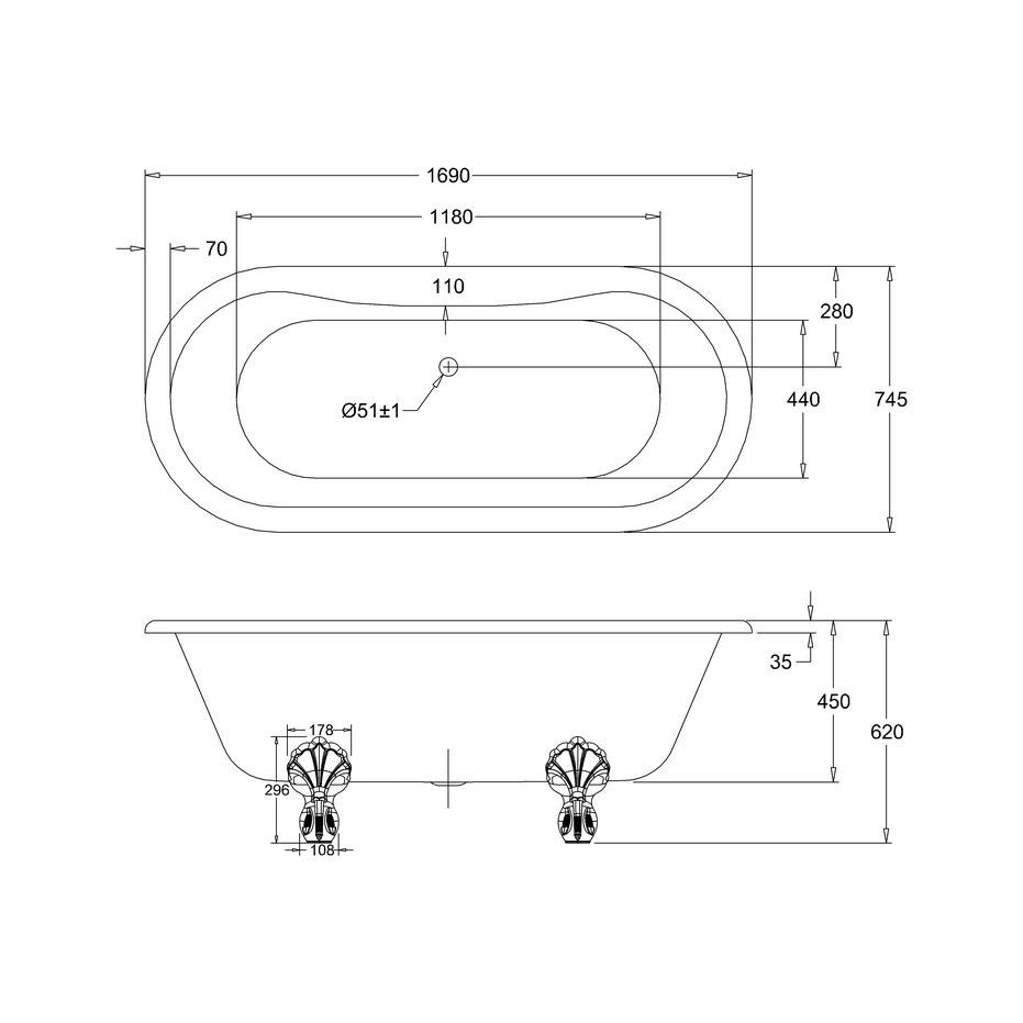 Windsor 170cm Double Ended Bath with Luxury Feet