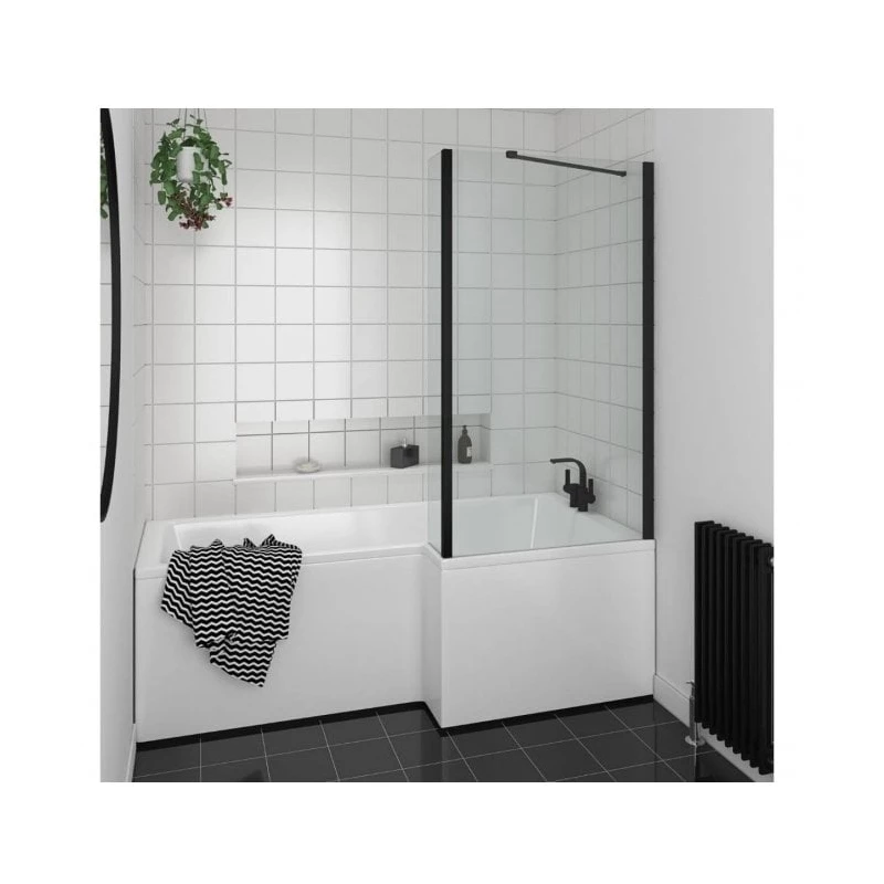 Essential Kensington 1500x850mm L Shape Shower Bath Pack with Bath Front Panel and Matt Black Bath Screen
