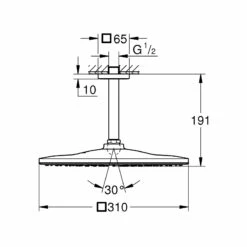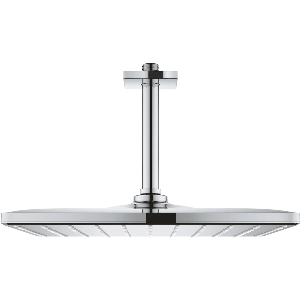 Update your bathroom with a sleek modern shower with eco-option – the Grohe Rainshower 310 Mono Cube head shower set. Step under a large, square shower head that gives great coverage, into the enveloping, gentle feel of Grohe’s PureRain spray. The 310mm shower head is designed to be ceiling-mounted on a 142mm arm. This shower lets you enjoy an even flow from every nozzle thanks to Grohe DreamSpray technology. Grohe EcoJoy limits water flow to 9.5 litre/minute for a comfortable water-saving shower experience. And the SpeedClean nozzle designs means you can brush them free of limescale with just a wipe of your finger. Hot water is directed away from the surface of the shower head via the Inner WaterGuide, extending the life of the sparkling but durable Grohe StarLight chrome finish that will keep its good looks for years to come.