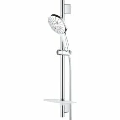 The sleek and stylish Grohe Rainshower 130 SmartActive hand shower comes with a TwistFree Silverflex shower hose (1750mm), matching rail (600mm) and a Grohe EasyReach tray to organize your shower space. It is also packed with innovative technology. Grohe SmartTip β an ergonomic controller on the rear of the handle β gives you fingertip control of the spray pattern: pulsating Grohe ActiveMassage spray, which delivers a whole new level of revitalising massage power, invigorating Jet Spray and Rain Spray β as gentle as warm summer rain. As soon as you turn the water off Grohe DripStop ensures there are no annoying drips from Rain and Jet spray. Thanks to Grohe DreamSpray, the flow from every nozzle has a perfectly balanced flow for maximum satisfaction, and the silicone anti-lime SpeedClean nozzles are extra easy to clean too. The scratch resistant Grohe StarLight chrome finish will stay looking pristine for years and the Inner WaterGuide prevents the surface from getting too hot, protecting both your skin, and the sparkling chrome finish. Installation is incredibly easy too β the Grohe QuickFix Plus system ensures you can use existing holes while Grohe TileFix gives you the flexibility to alter the depth of each bracket to create a perfect fit, ideal for partially tiled bathrooms.