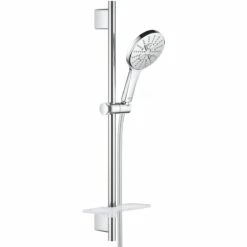 The sleek and stylish Grohe Rainshower 130 SmartActive hand shower comes with a TwistFree Silverflex shower hose (1750mm), matching rail (600mm) and a Grohe EasyReach tray to organize your shower space. It is also packed with innovative technology. Grohe SmartTip β an ergonomic controller on the rear of the handle β gives you fingertip control of the spray pattern: pulsating Grohe ActiveMassage spray, which delivers a whole new level of revitalising massage power, invigorating Jet Spray and Rain Spray β as gentle as warm summer rain. As soon as you turn the water off Grohe DripStop ensures there are no annoying drips from Rain and Jet spray. Thanks to Grohe DreamSpray, the flow from every nozzle has a perfectly balanced flow for maximum satisfaction, and the silicone anti-lime SpeedClean nozzles are extra easy to clean too. The scratch resistant Grohe StarLight chrome finish will stay looking pristine for years and the Inner WaterGuide prevents the surface from getting too hot, protecting both your skin, and the sparkling chrome finish. Installation is incredibly easy too β the Grohe QuickFix Plus system ensures you can use existing holes while Grohe TileFix gives you the flexibility to alter the depth of each bracket to create a perfect fit, ideal for partially tiled bathrooms.