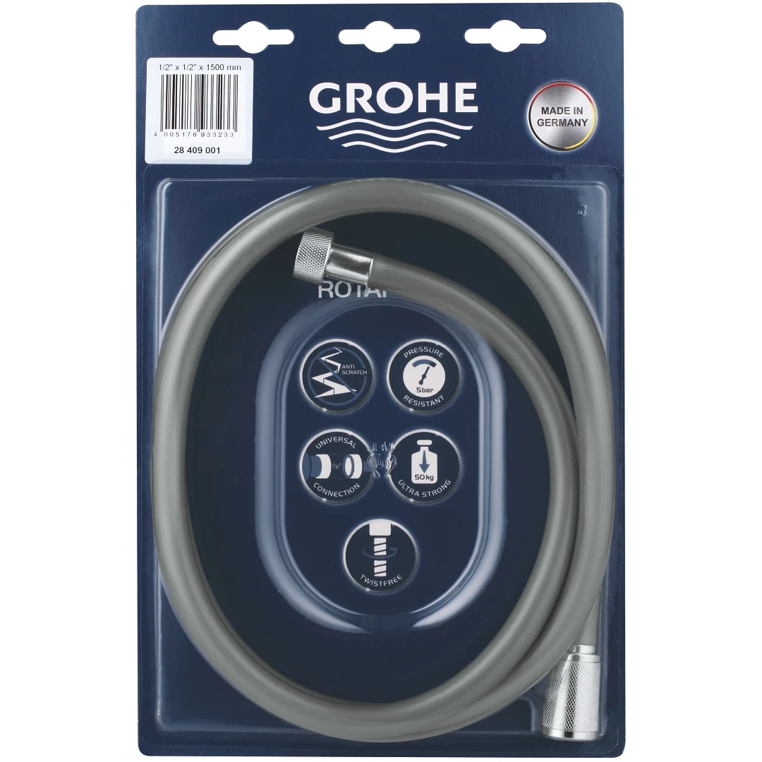 The Grohe Rotaflex shower hose is perfect in all bathrooms and with a length of 1500mm, ideal for a shower system or shower rail set. This sturdy hose is built to revel in hard work and can withstand water pressure up to 5 bar, tension up to 50kg and heat up to 70°C. Built with a rotation cone, it is twist-free for ease of use. The smooth AntiScratch surface is easy to clean – one wipe with a dry cloth and it looks like new – and it won’t cause any damage if it comes into contact with the shower cubicle or bathtub. The AntiFold feature ensures it won’t bend and end up with annoying kinks. Fitting is swift and simple too as it comes with standard 1/2″ connections and is compatible with all standard hand showers. The connection nuts made of sturdy metal have a gleaming Grohe StarLight chrome finish and a ribbed surface so they are easy to grip.