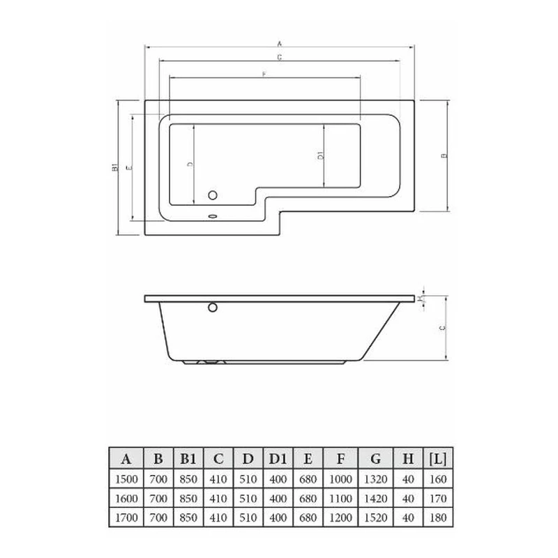 Simplicity L-Shape 1700x700mm Single End Shower Bath Only – Right